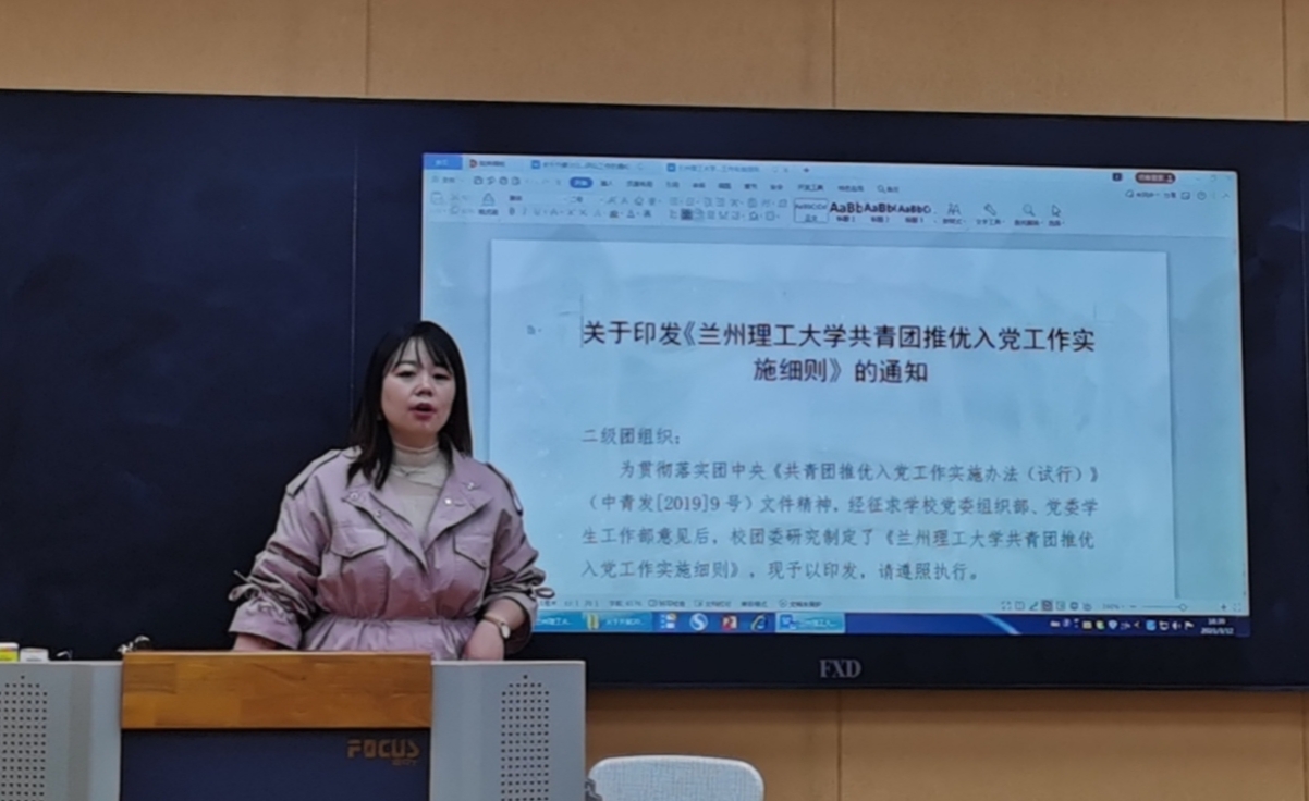为增强团员先进性建设,严格团员教育管理,落实全面从严治团要求,进一步贯彻落实团中央《新时代共青团员先进性评价指导大纲(试行)》、《中国共产主义青年团基层组织“三会两制一课”实施细则(试行)》、《共青团推优入党工作实施办法(试行)》、《兰州理工大学共青团推优入党工作实施细则》等文件精神,3月12日下午,材料学院团委组织“团员教育评议暨推优入党工作实务”主题团课。本次团课由材料学院团委书记刘舒婕主持,材料学院团支书参与学习。