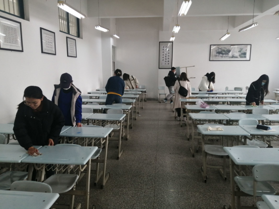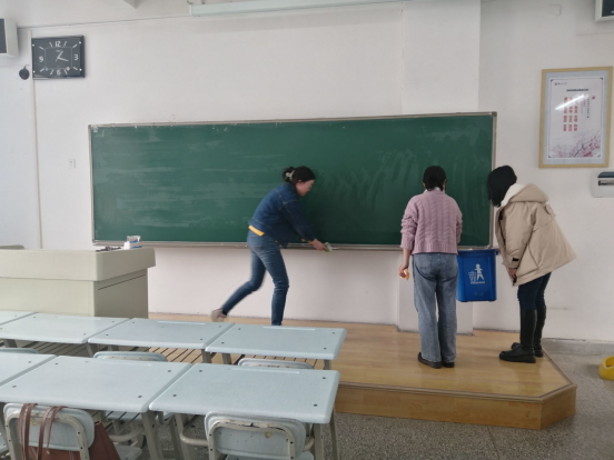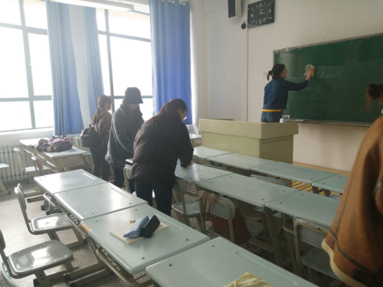 当天,支部所有党员同志自带抹布,在支部书记的带领下志愿清理彭家坪校区观成楼一教室的桌椅、黑板和讲台。由于近日恶劣的沙尘天气,桌椅上落下了一层厚重的尘土。党员同志们纷纷撸起袖子加油干,有的负责清洁桌椅,有的负责清洁讲台、黑板,很快便将1号楼三层小教室清洁完毕。