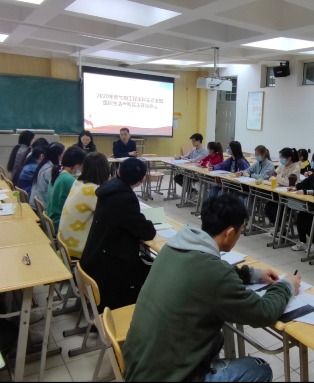 3月17日下午,生物工程本科生党支部在彭家坪校区1南教室召开2020年度组织生活会,开展民主评议党员。学院党委书记陈永泰到会指导。会议由支部书记代莎主持。支部全体党员参加会议,部分入党积极分子代表列席会议。