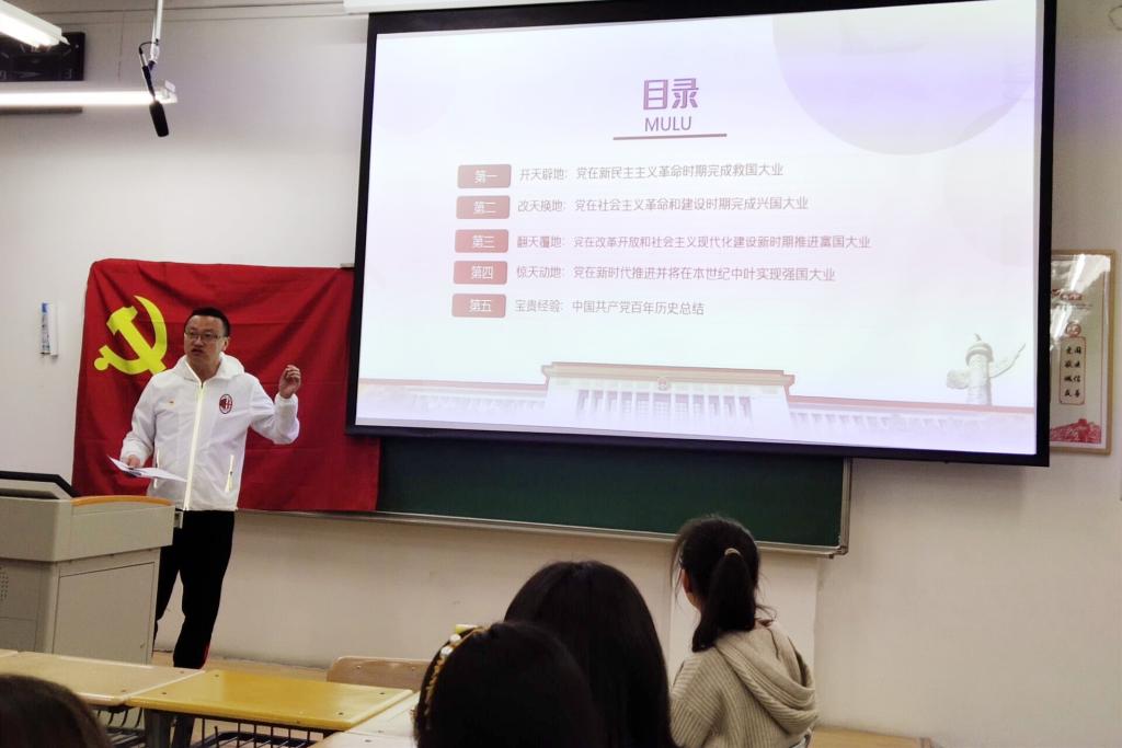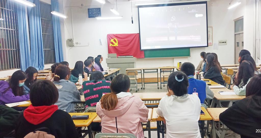 支部书记薛坚同志以“光辉历程,光荣使命”为主题讲授党课,他在党课中结合中国共产党在百年发展中的光辉历程与经验收获,分享了党史学习的必要性,以及如何学党史,共同探讨了作为时代新人的大学生。在崇尚英雄、学习英雄的过程中如何胸怀“两个大局”、树立“大历史观”,如何将榜样的力量传承到自身,赓续共产党人的精神血脉。