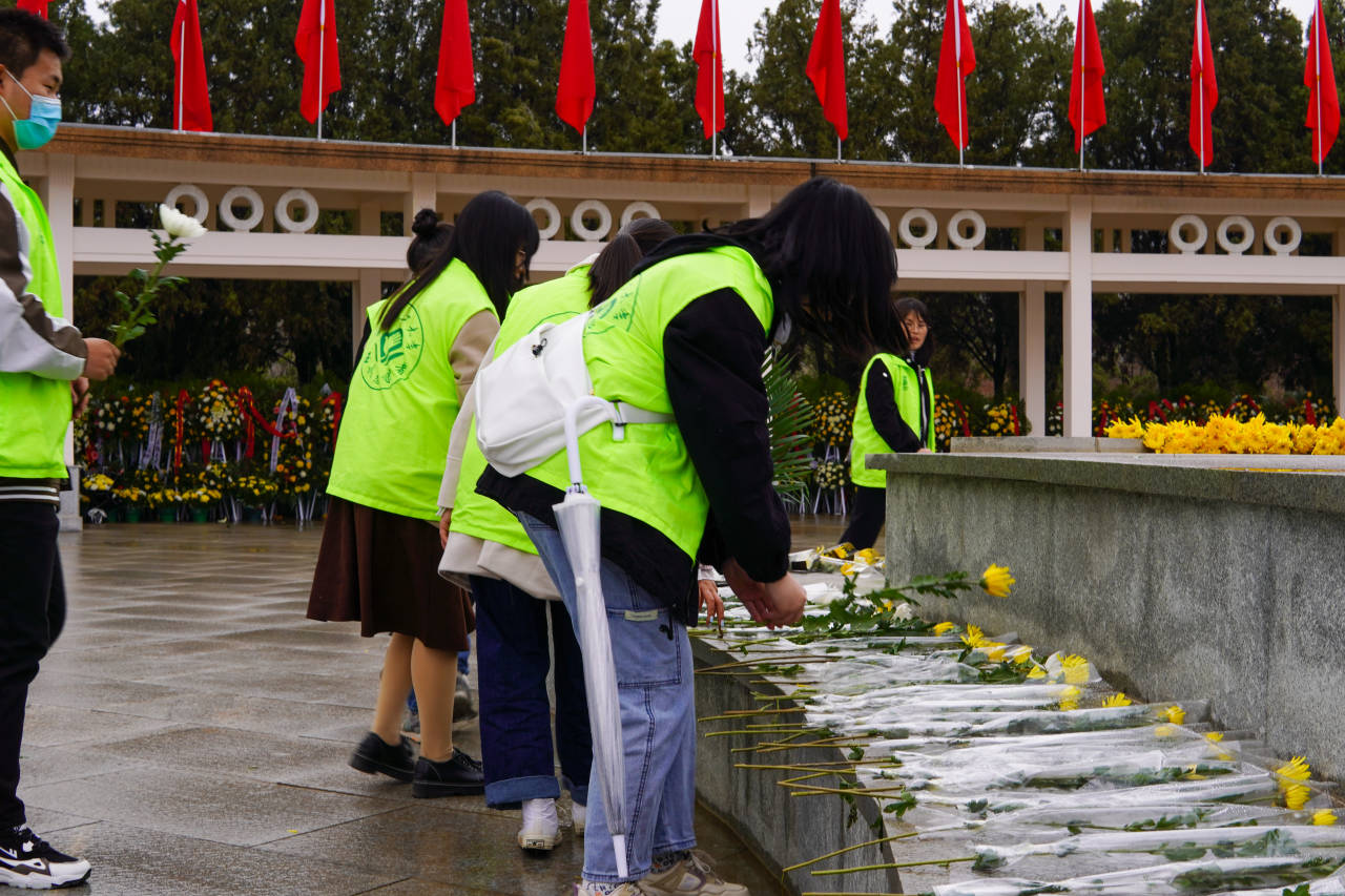 上午九时许,活动正式开始。同学们在濛濛细雨中唱响了国歌,仰望着高耸的英雄纪念碑,历史的厚重感扑面而来。国歌奏唱完毕,广场里响起了主持人斗志昂扬的宣讲声,志愿者们神色肃穆,表现出对英雄最沉痛的哀思。同学们面向纪念碑庄严宣誓,高昂自信的声音表现出他们作为新时代红色精神的传承者应有的斗志。同学们逐一向先烈献完花,并清扫墓园。至此,活动圆满结束。