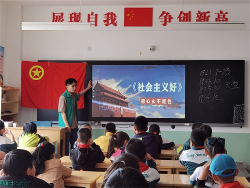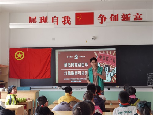 4月13日下午,我校环保协会的志愿者赴兰州市龚家湾第三小学、火星街小学开展了主题为“童心向党迎百年,红船歌声引未来”的红歌党史宣讲会。他们把红色经典音乐带入小学课堂,精选一些具有典型性和时代特征的音乐作品,按照历史时序一一呈现,展示了中国共产党辉煌的历史画卷,每带学生听一首红歌,便为他们讲一段故事。