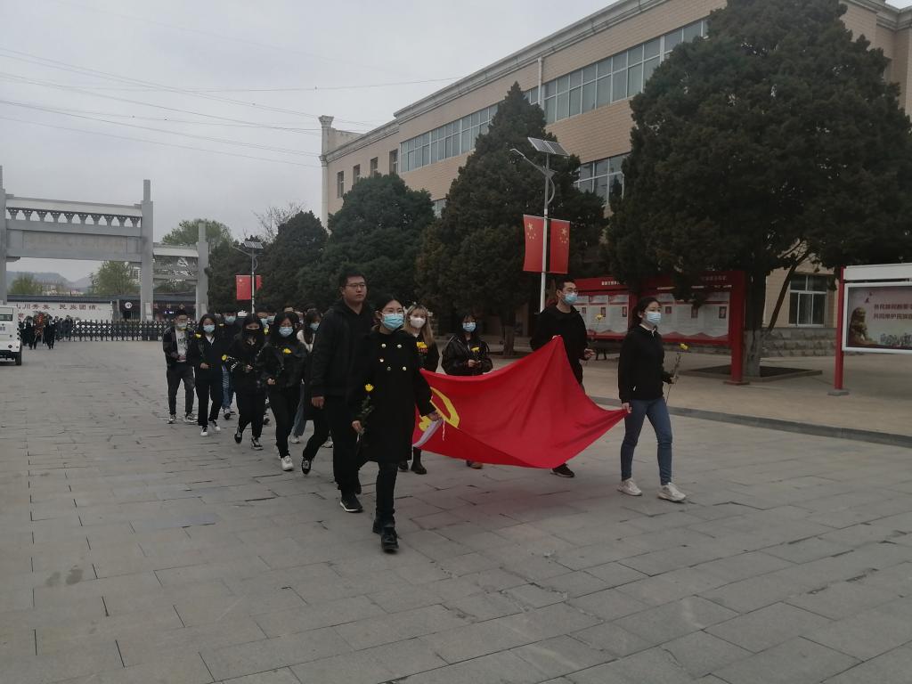全体党员向着革命烈士纪念碑列队行进,党员代表握着党旗,迈着坚毅的步伐,参加祭扫的全体同志在革命烈士纪念碑前肃立、默哀,寄托对烈士的缅怀与哀思。