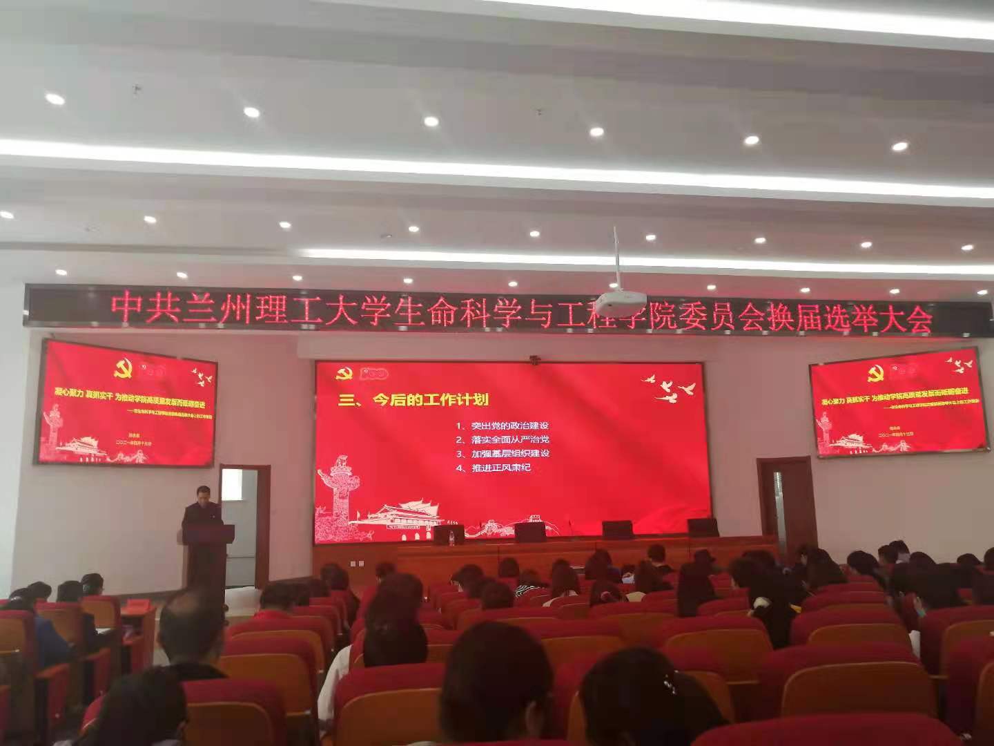 4月13日下午,中共兰州理工大学生命科学与工程委员会换届选举大会在兰工坪校区图书馆二楼报告厅隆重举行。学院全体师生党员参加大会,党外人士代表和退休教师受邀出席大会。学院党委副书记武军莉主持大会。