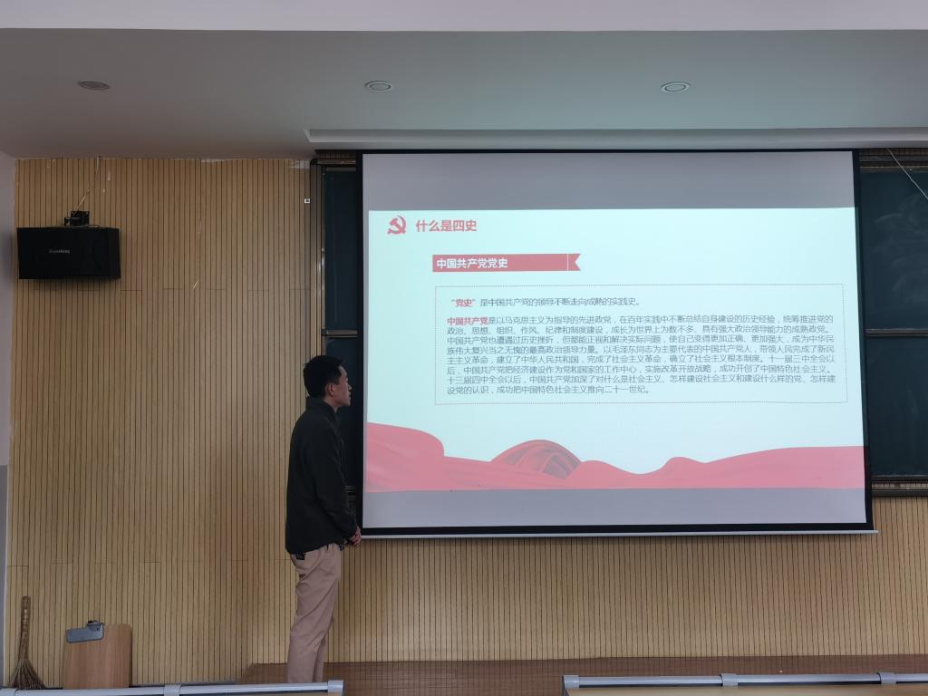 活动由学生工作人员张小舟和廖伟东主持。先是通过观看视频让同学们了解什么是“四史”,以及学习“四史”对现阶段大学生思想起到的积极作用。之后以中国共产党成立以来召开的历次党的代表大会为主线,以党的曲折历史为出发点,带领着同学们一起学习党史。中国共产党百年历史中所创造的伟大成就“开天辟地、改天换地、翻天覆地、惊天动地”,同学们深受鼓励,从党史学习中激发信仰、获得启发、汲取力量,不断坚定“四个自信”,不断增强做中国人的志气、骨气、底气,树立为祖国为人民永久奋斗、赤诚奉献的坚定理想。