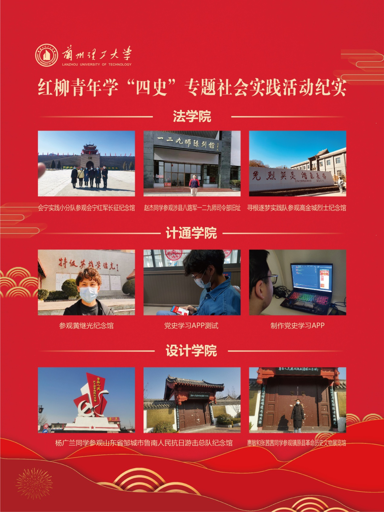 充分利用甘肃丰富的红色文化资源、红色教育基地等开展实地探访活动。组织开展红柳青年学“四史”返家乡寒假社会实践活动,全校1000余名同学以生源地为主,通过参观生源地的革命纪念馆、展览馆、博物馆、工矿企业、开发区等地,以视频、图片、访谈等形式,记录所见、所闻、所思,并以微视频、推文、H5页面等形式宣传红色文化,讲述红色故事,感受国家发展历程。开展“踏寻百年党史,讲述甘肃红色故事”活动,青年师生带领同学们打卡甘肃红色革命圣地,通过边走边学、现代与历史交叉的形式,将鲜活的历史人物和故事再现,在参观、瞻仰、讲述、学习、探究、实践中追溯党的百年历史变迁,体验共产党人一路走来的艰辛与不易。