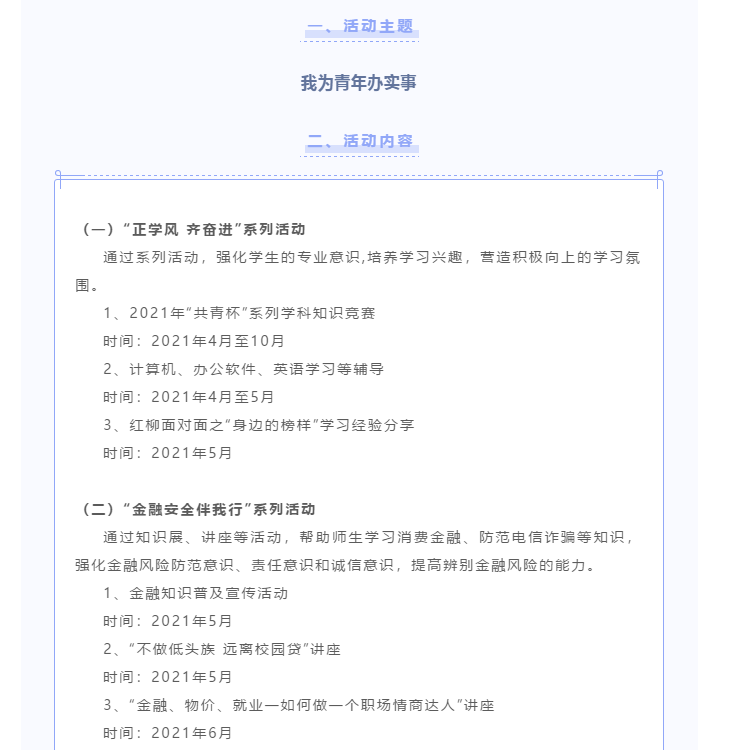 深化密切联系青年机制,推出“我为青年办实事”清单,帮助青年解决急难愁盼的事,助力青年追梦圆梦,将学习热情转化为勇担当办实事的新成效。其中的“正学风 齐奋进”、“金融安全伴我行”等系列活动切合学生实际需求。推出学生权益服务系列活动,在红柳青年微信公众号开通“权益服务”平台,编写《校园一本通》手册,进一步畅通学校和学生沟通的渠道。开展师生专属优惠活动、青年教职工专属活动,为青年办看得见、摸得着的实事,在办实事、解难题中学有所获、用有所得。