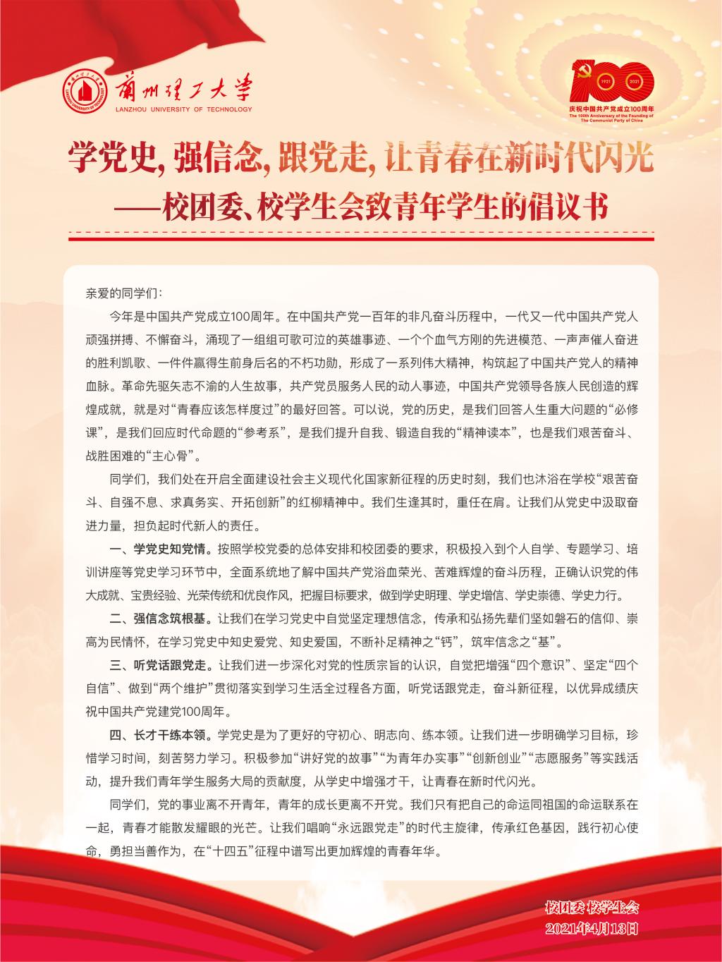 《学党史,强信念,跟党走,让青春在新时代闪光》倡议书