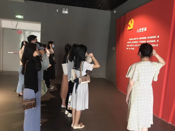 英语研究生党支部通过参观甘肃省博物馆党史学习教育主题展馆,回顾往昔峥嵘岁月,感叹幸福生活得来不易。在鲜红的党旗下,党员们高举右手,表情庄严凝重,在重温历史中补足精神之钙,在接受红色教育、传承红色基因中砥砺初心使命。