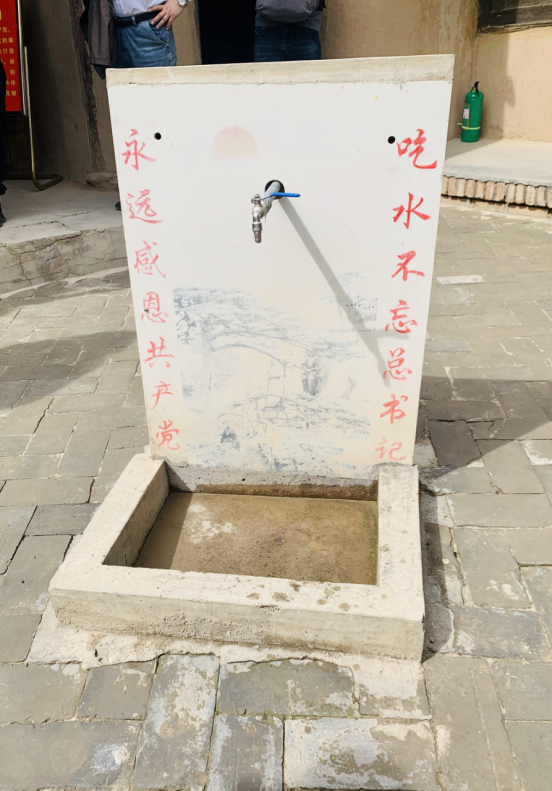 在布楞沟,家家户户的院子里砌着一座井台,井口后方立着一块矮壁,白色瓷砖两侧,两行红彤彤的大字格外显眼——“吃水不忘总书记,永远感恩共产党”。