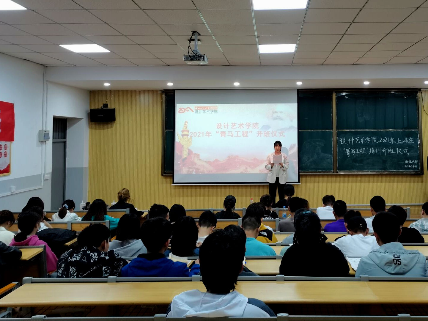 5月21日晚,设计艺术学院在琢玉楼107教室举行了举行2020-2021学年第二学期“青马工程”开班仪式。设计艺术学院全体青马培训班学员及学院团委指导老师宋美瑾参加开班仪式。