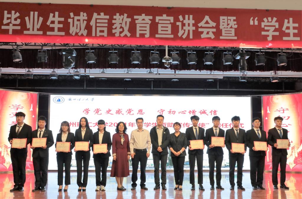 贷款毕业生代表电信学院王生俊作了发言,石化学院韩聪聪同学带领大家一起进行了庄重的诚信宣誓仪式。机电学院党委副书记张轶宣读了《关于聘任王雅婷等22名同学为兰州理工大学“学生资助宣传大使”的决定》,与会领导为22名同学颁发了聘书并安排了“学生资助宣传大使”的工作和任务。
