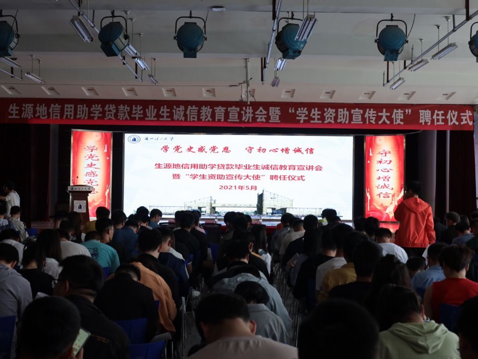 5月25日,学校分别在彭家坪校区、兰工坪校区大学生活动中心召开生源地信用助学贷款毕业生诚信教育宣讲会暨“学生资助宣传大使”聘任仪式。国家开发银行甘肃省分行客户五处客户经理安刚刚、机电学院党委副书记张轶、石化学院党委副书记张飞龙、各学院辅导员、贷款毕业生参加会议,会议由学生工作部副部长李荣华主持。