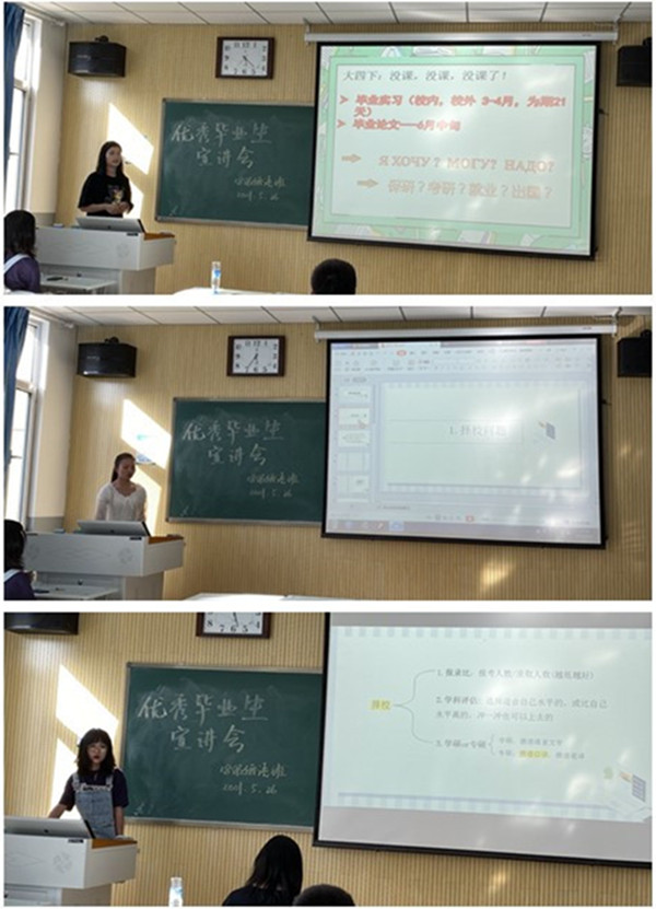 本次宣讲会分为就业与考研两个方向,首先由韩佳秀、吴新年、郭娟三名同学分享了自己的就业经验。她们结合精心制作的PPT,为同学们讲述了现阶段就业心得,简历的制作与投递、面试技巧等精彩内容,鼓励大家转变就业观念,认清就业形势,提前做好准备,积极行动,向未来迈出勇敢的步伐。