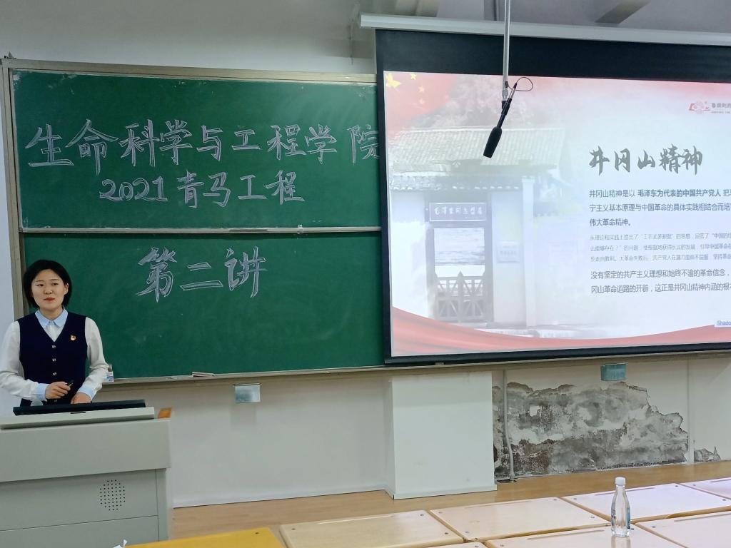为深入开展党史学习教育,切实做到“学史明理、学史增信、学史崇德、学史力行”,扎实推动党史学习教育走深走实,促进学生中的优秀骨干分子快速成长,生命科学与工程学院团委于2021年6月1日晚在彭家坪校区观成楼106举行2021年“青马工程”培训第二讲“光辉的形象,伟大的精神”报告会,报告特邀鲁南制药集团“沂蒙精神”宣讲团成员张全恩等一行4人来校宣讲。生命学院党委副书记武军莉、团委书记代莎,生命学院两委会成员八十余人参会,会议由武军莉主持。