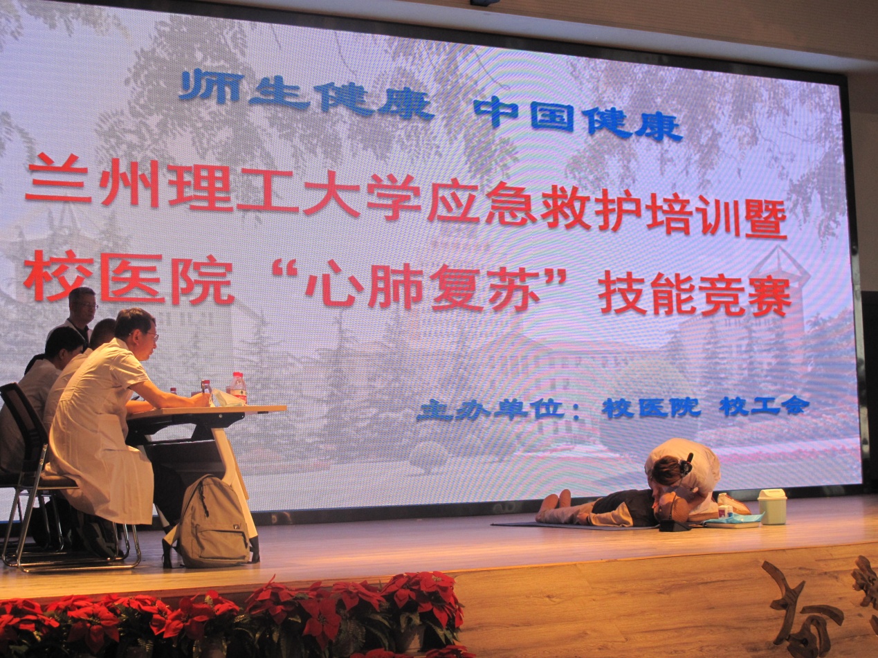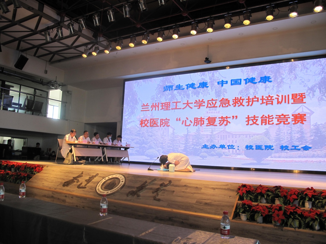 为庆祝建党100周年,贯彻执行习近平总书记关于健康中国建设的重要论述和在全国劳动模范和先进工作者表彰大会上的讲话精神,2021年6月10日下午,校医院联合校工会在兰工坪校区大学生活动中心举办了“兰州理工大学应急救护培训暨校医院心肺复苏技能竞赛”,学校党委常委、副校长宋琦,校工会常务副主席田波以及来自生命学院、材料学院、后勤处、保卫处、附属中学、校医院、应急协会的近150名教职工、学生参加了这次活动。