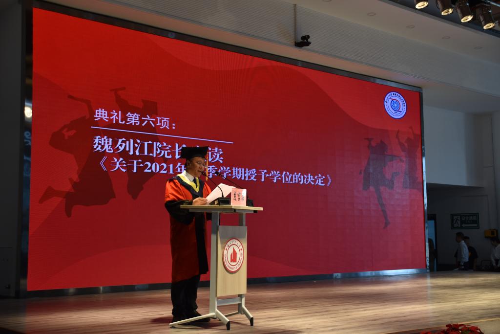 毕业典礼在庄严的国歌声中开始。赵伟国宣读《关于准予2021届本科生毕业的决定》,韩伟宣读《兰州理工大学2021年春季学期关于准予研究生毕业的决定》,张人会宣读《兰州理工大学关于表彰2021届优秀毕业生的决定》。李仁年为优秀毕业生颁奖。