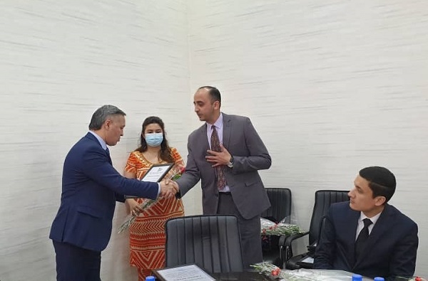 穆罕默德(右二)被塔吉克斯坦工商协会授予“优秀工作人员”称号