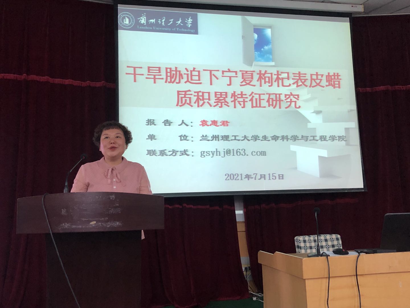生物工程学位授权点负责人冷非凡副教授进行了研究生招生宣传,内容包括学校学院简介、师资力量、科学研究与学科建设、平台建设等十个方面,冷老师从考生们关心的招生政策、报考条件和考试科目、研究生复试及录取情况、研究生待遇等方面做了解疑答惑。袁惠君副教授作了题为“干旱胁迫下宁夏枸杞表皮蜡质积累特征研究”的学术报告。报告介绍了袁老师课题组近5年来在旱生经济灌木扁果枸杞抗旱特征及表皮蜡质合成机理方面的研究成果。