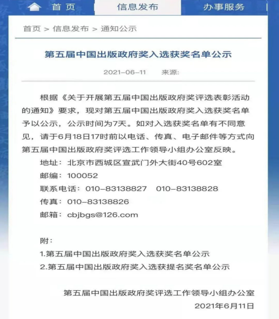 中国出版政府奖是我国新闻出版领域的最高奖,每三年评选一次,旨在表彰和奖励国内新闻出版业优秀出版物、出版单位和个人。第五届中国出版政府奖设有7个子项奖,共计240个奖励数额;另设立提名奖240个,其中,图书提名奖120个。