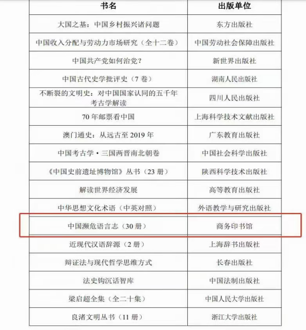 《中国濒危语言志》是中国语言资源保护工程的标志性成果之一,项目分为濒危汉语方言系列和濒危少数民族语言系列,获得国家出版基金资助。是“十三五”国家重点图书出版规划项目,荣登中国出版集团有限公司组织评选的“中版好书”2019年度榜人文社科榜单第7位。