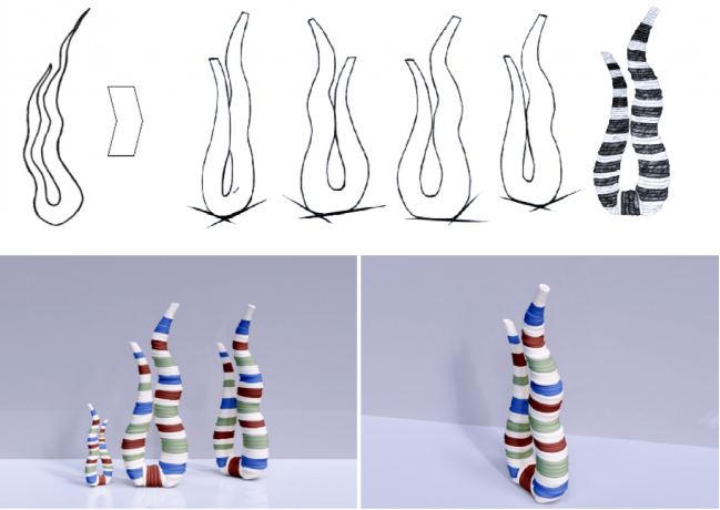 敦煌莫高窟壁画的佛背光火焰纹(北魏275窟 中心柱东向龛内天人化身火焰纹),近似对称、动静结合、刚柔并济、形态似火,给人朝气蓬勃,积极向上的感觉。本设计提取火焰纹的动势线条,将其应用于花瓶摆件,旨在将敦煌艺术的美学特征赋予现代家居产品。鉴于李家山造纸的易染色与韧性的特点,本设计将其搓捻为纸绳,盘绕于花瓶的素胎上,营造特殊的纹理与质感。纸绳染色参考壁画提取色。
