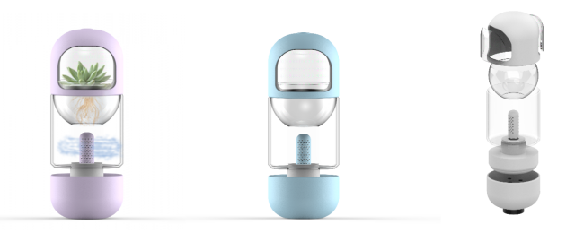 这是一款为儿童设计的多肉植物培养器物,采用水培方式对多肉植物进行培养,透明塑料材质外壳方便随时观察植物生长状况,独特的添加营养液方式,给予儿童更多视觉上的反馈,语音交互系统定时提醒换水加营养液,通过按压顶部,力量传递到底部营养液槽,使营养液槽产生挤压,将液体挤入管体,形成水雾效果进入容器内部。将水的状态变化传达给儿童,引起他们探索的好奇心。
