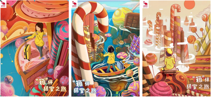 本作品以插画的形式,表现了爱华仕糖果箱的特点。三幅插画分别代表糖果箱的三种颜色,以在糖果世界中旅行为故事主题。