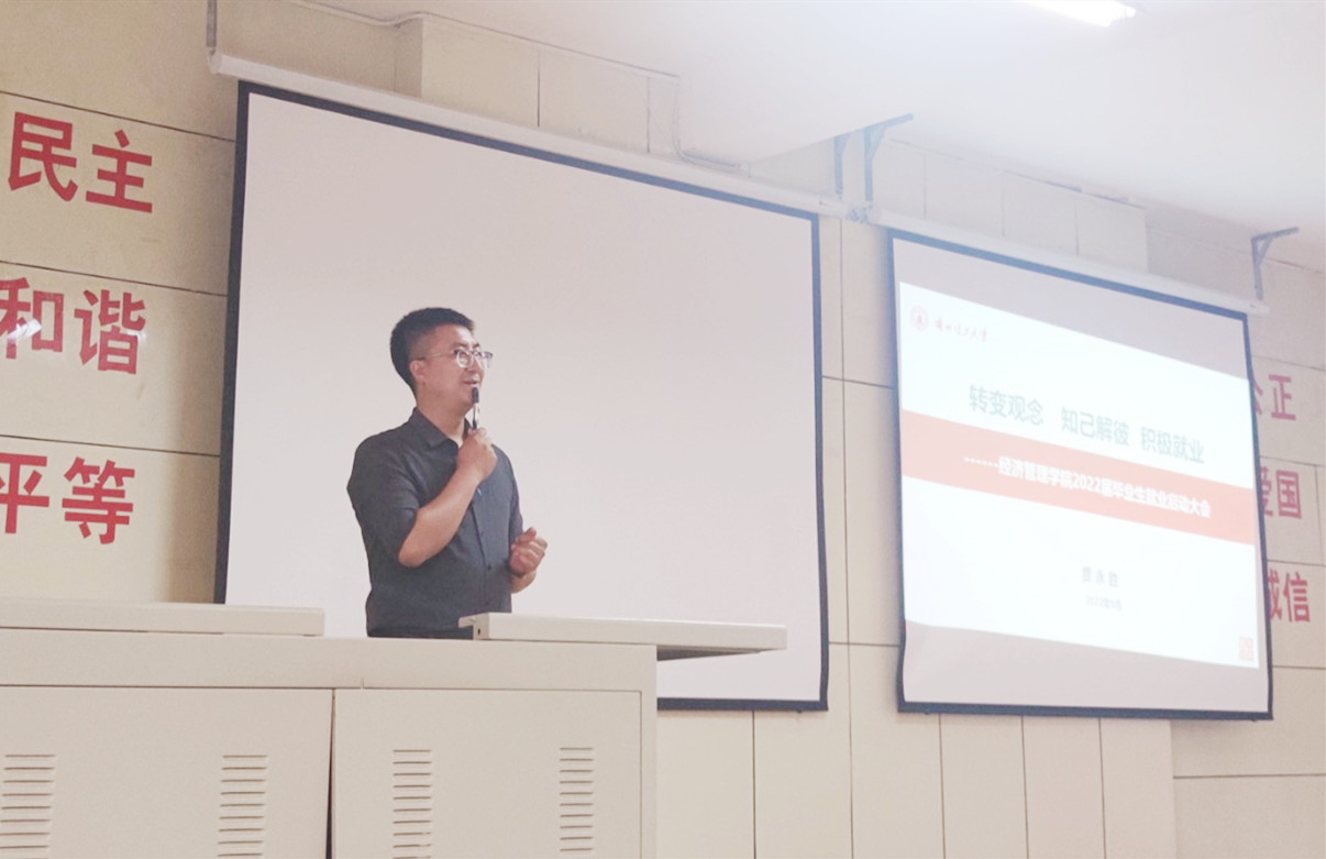 9月12日下午,经济管理学院在彭家坪校区召开2022届毕业生就业创业动员大会暨“转变观念 知己解彼 积极就业”报告会。2018级全体同学参加会议,会议由年级辅导员张晚霞主持,王家湘老师参加,贾永胜老师做专题报告。