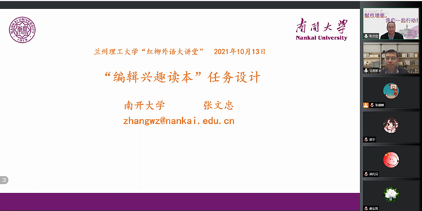 10月13日晚,南开大学张文忠教授应外国语学院邀请做了题为“编辑兴趣读本任务设计”的线上学术讲座。讲座由外国语学院院长任育新教授主持,外国语学院教师、研究生及部分本科生参加了此次学术活动。