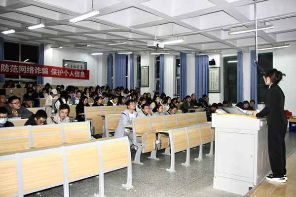 宣讲团分析了校园电信网络诈骗案件发案类型、受害群众年龄和性别,并结合网络兼职刷单诈骗、网络购物诈骗、网络贷款类诈骗、网上交友诱导透支理财诈骗、冒充熟人及公检法诈骗等诈骗类型和案例,以视频、讲解等方式全面深入的总结了犯罪分子的作案手段、受害人上当受骗的心路历程、防范电信网络诈骗的方法和被骗后应采取的补救措施。