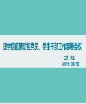 10月27日中午,根据学校相关文件精神,理学院党委统一部署,统一指挥,严守校园安全底线,理学院制定详细疫情防控方案,宿舍进行网格化管理,充分发挥党员、学生干部疫情防控中的战斗堡垒作用和先锋模范作用,充分发挥各级团学组织作用,在疫情防控中推动党班团一体化建设,召开了党员学生干部工作部署会议,会议由辅导员安星主持,学院党委副书记杨合立、辅导员赵倩倩、辅导员翟亚男、古丽老师及全体学生党员、学生干部参会。