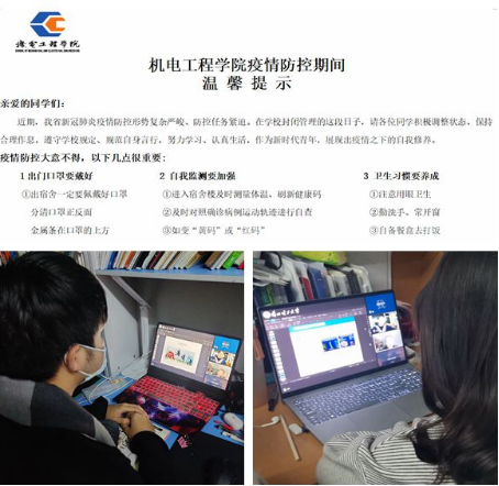 学院梳理和整理近期关于疫情防控的各项文件和要求,集成制作面向学生的温馨提示,通过线上和线下生活区张贴的方式,广而告之。同时开通疫情防控期间线上心理辅导室和线上意见建议反馈邮箱,打通学生反映问题线上渠道,帮助学生及时疏导焦躁情绪,为同学们营造健康安全的学习生活环境。通过专题班会和线上集体观看防疫心理讲座等形式,鼓励学生与国家和学校同行,齐心协力,做好课程学习和安全防护,做到健康、学业两不误。