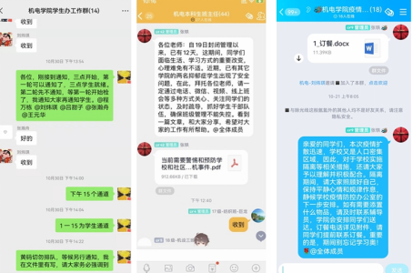 建立学院领导、辅导员、班主任联动工作机制,组织召开全体班主任线上工作会议,明确分工和协作事宜,强化班级和宿舍管理,强化教师人文关怀教育。副书记、辅导员和班主任通过实地走访学生宿舍、线上群组、线上班会、组织开展班级凝聚力大赛等形式,及时了解学生实际情况和动态变化,督促学生做好安全防控、线上学习。建立隔离学生微信群及QQ群,安排一对一联系人,每天早晚线上联系,加强人文关怀,及时回应并和多部门沟通协调解决同学们提出的各种困难。