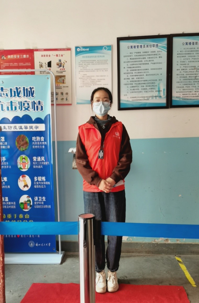 虽然一站就是几个小时,但是她没有一丝怨言,按要求认真完成任务。“乌云遮不住太阳,阴霾终究会散开,唯有努力不会被辜负。在这场没有硝烟的战“疫”中,各位同学心往一处想、劲往一处使、拧成一股绳,我相信,防控疫情阻击战,我们必将取得胜利!”