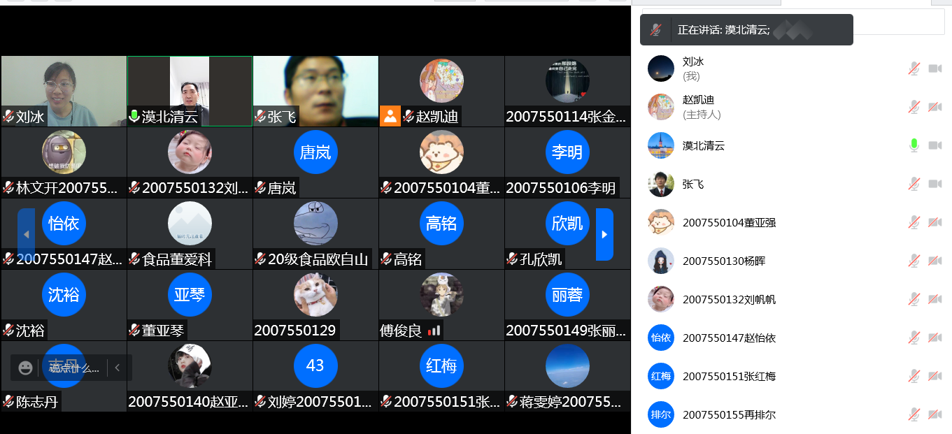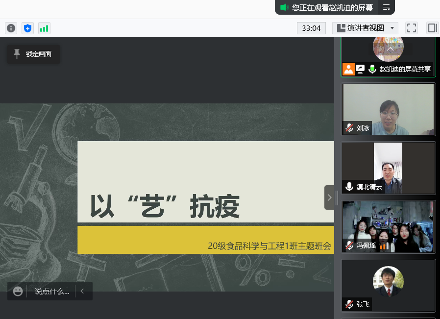 深秋结束,寒冬将至,同心战“疫”,迎接疫散新生活。11月9日晚19:30,生命学院2020级食品科学与工程一班通过腾讯会议平台开展了以“艺”抗疫线上主题班会。学校科技处副处长张飞、学院党委书记陈永泰、班主任刘冰以及全体学生参加了此次线上班会。