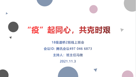 关注关爱学生,班主任冯微时常惦记、关心班上状况,在所在的班级2018级道桥2班安排了线上班会,了解学生就业、考研情况,并重点关注了学生疫情期间的心理健康状况,同时推荐了多种疫情期间缓解心理压力、丰富课余生活及积极锻炼身体的途径。由班干部汇报近期班级各方面情况,部署了疫情期间防疫抗疫工作安排,如核酸检测、就餐、志愿者、黄码同学转绿码、隔离等,就上课、考勤、作息和宿舍卫生做了强调,并询问就业签工作和考研准备情况,并注重心理健康的提醒,可通过心理援助热线服务、潮汐app、阅读书单、业余爱好等增强狭小空间的适应度,并鼓励同学们利用keep加强室内锻炼。