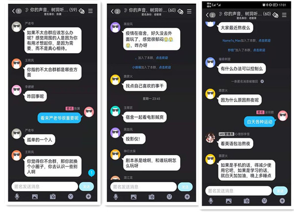 外国语学院心理健康辅导站通过宣传,倡议同学们加入“你的心声,树洞听到了”QQ聊天群,发布一些热点话题引导学生匿名发言讨论,提出自己近期的苦恼和困惑,互相出言献策,共同探讨解决问题的方法;同时学生可以私聊群内心理健康辅导站的工作人员,单独倾诉自己遇到的困难或压力,辅导站将收集到的共性问题进行分析研讨,针对性地逐一解决。