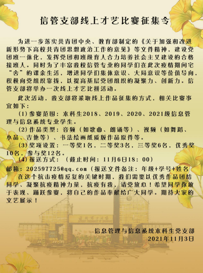 为进一步落实共青团中央、教育部制定的《关于加强和改进新形势下高校共青团思想政治工作的意见》等文件精神,建设党团班一体化,发挥党团和班级育人合力培养社会主义建设的合格接班人。同时为了丰富学生我校信息管理与信息系统专业的同学们在此次疫情期间宅“舍”的课余生活,增进同学们集体意识、大局意识等价值导向,积极向党组织靠拢,以提高基层党团组织的凝聚力、创新力。据此,围绕着"凝聚力量,齐心抗疫"的主题,信息管理与信息系统本科生党支部于2021年11月3日至11月9日成功举办了一次线上才艺比拼活动。