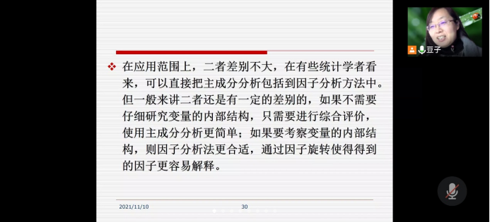 《高级应用统计分析》课堂上,侯玉君老师用生动的语言将晦涩难懂的统计学知识深入浅出的教给同学们,对于每一个问题都细心解答,同学们也十分积极,提前进入课堂等待老师上课,线上上机课,为了解答每一位同学的问题,侯玉君老师通过各种方式进行随时解答,保质保量完成了教学任务,线上上机与课堂教学结合保证了教学质量的教学效果。