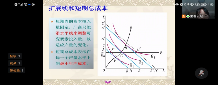 云端课堂上,《中级微观经济学》课堂上,冯文芳老师积极和同学们互动,询问“孩子们你们听懂了吗?”“孩子们你们有没有什么困难”让每一位同学感受到了亲切和温暖,并及时了解学生的学习情况,调整自己的教学方式,确保每一位学生都能在线上领悟每一个知识点,切实做到改变教学方式不改变教学质量,对于每节课学生所存在的问题都会整理在QQ群里进行解答。为了督促学生课后学习,都会安排课后问题要求学生作答,并在群里建专门相册作为作业的批阅。同学们也积极响应,第一时间和老师互动,将自己所存在的问题提出并得到第一时间解答。虽然线上教学,几乎达到了新下教学的共鸣和学习效果。