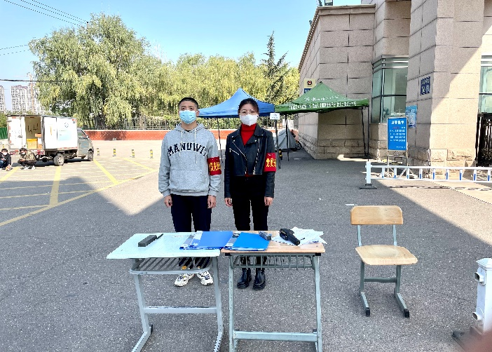 志愿者党员王亚瑞:我们的工作就是督促大家打开健康码,提醒他们测温后再进入宿舍楼。大家都能够积极按照学校要求,配合我们的工作,一起加油!