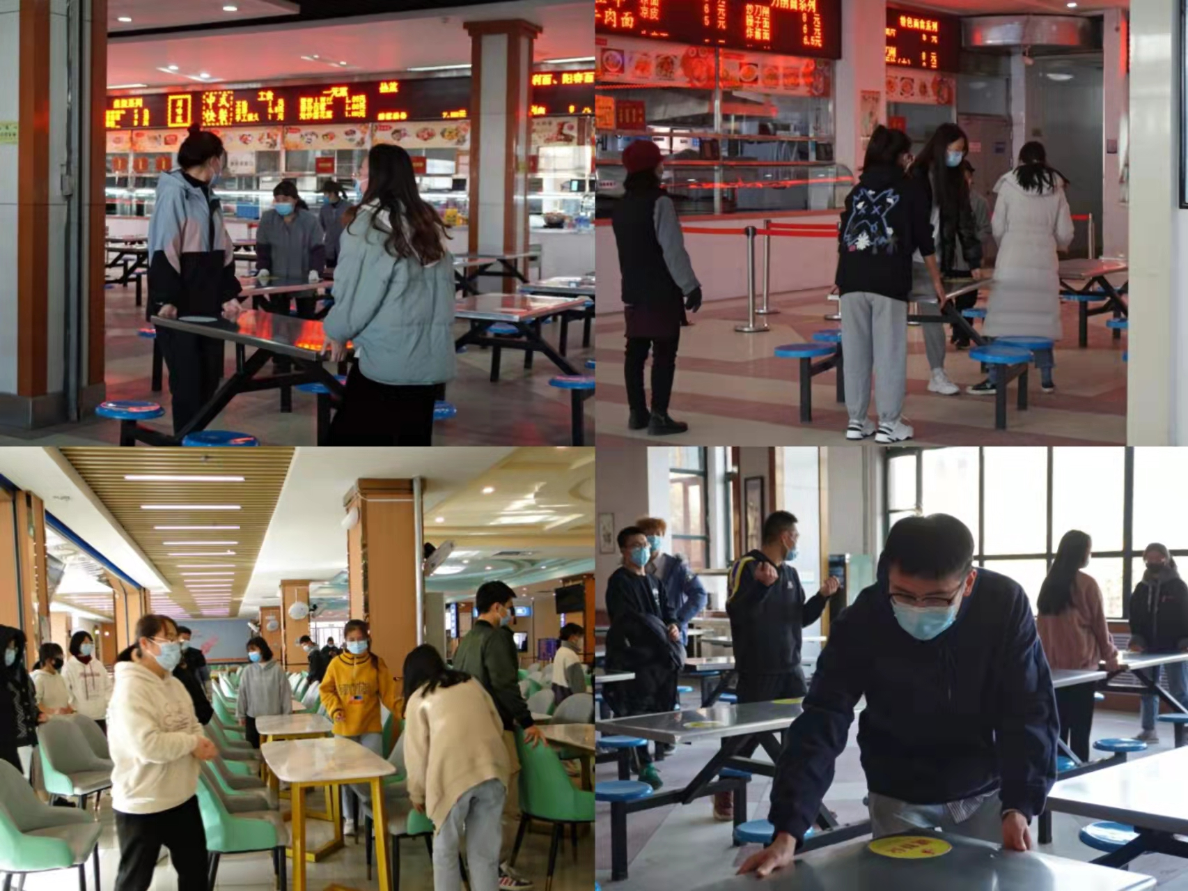 根据活动安排,各个学生支部按照小组有序开展,分别负责南北村食堂的桌椅摆放以及卫生打扫。男生党员积极主动承担搬运餐桌等重活,女生党员也有序协调负责餐椅摆放。寒冬季节,每名支部成员都在用自己的热情为大家服务,为恢复学校正常就餐秩序贡献自己的力量。