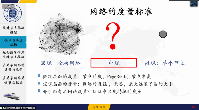 闫光辉教授做了《融合多维信息的复杂网络关键节点挖掘研究》主题报告,分别从节点之间可能存在的交互性和传递性,介绍了面向网络高阶结构和多关系网络上的关键节点挖掘研究进展。
