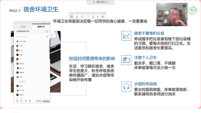 一是环境卫生方面。由于疫情的影响,校园封闭管理,大家要加强环境卫生的整治。班主任强调环境卫生将直接影响每一位同学的身心健康。要求各班生活委员和各宿舍长要切实担其应有的责任,督促班里,尤其是宿舍环境卫生的持续改善。