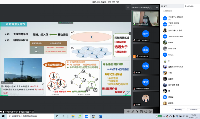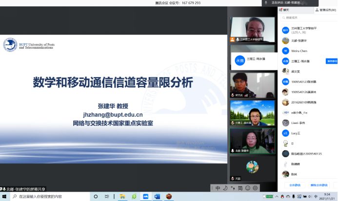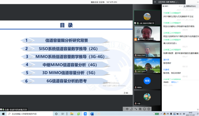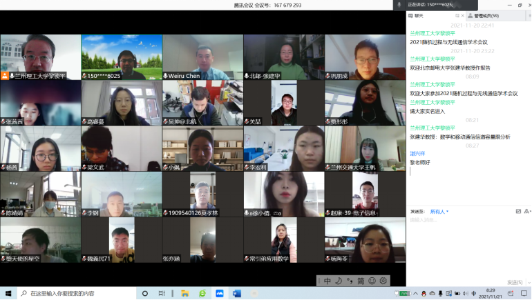 为交流随机过程与无线通信领域研究的最新成果,加强兰州理工大学理学院学科内涵发展,11月21日,兰州理工大学理学院联合电信学院、计通学院通过腾讯会议平台共同在线举办了“2021随机过程与无线通信学术会议”。会议邀请国家杰出青年基金、优秀青年基金获得者、中国通信学会会士、IEEE 高级会员、我国 IMT-2030(6G)工作组频率子组副组长、IMT-2020(5G)推进组频率子组副组长、北京邮电大学博士生导师张建华教授,法国学者、中组部“海外高层次引进人才青年项目”入选者、中山大学博士生导师陈林教授,美国阿肯色理工大学副教授陈伟儒博士,IEEE高级会员、西安理工大学副教授魏嵬博士,武汉工程大学副教授巩朋成博士,北京航空航天大学吴坤博士和兰州交通大学王帆博士等参加会议并作大会邀请报告。电信学院博士生徐倩毓、杨飒,理学院硕士生梁文武等同学也作了学术报告。本次会议由理学院“随机系统优化与控制”红柳学科方向责任教授黎锁平老师、学科组成员周永强副教授先后主持。来自西安电子科技大学、兰州大学、武汉烽火集团、兰州文理学院和我校师生共150余人在线参加了本次会议,并进行了热烈讨论与互动。