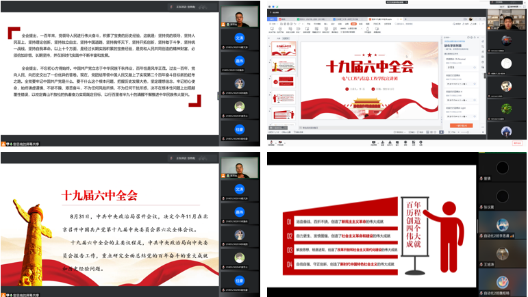 按照学校党委《关于认真组织党委理论学习中心组专题学习党的十九届六中全会精神的通知》文件精神,电信学院党委结合实际制定学习方案,分层分类,周密安排,组织全院师生认真学习、深刻领会党的十九届六中全会精神,将思想和行动统一到全会精神上来,作为当前和今后一个时期的首要政治任务,以高度的政治责任感和使命感做好全会精神的学习宣传工作,推动学习教育全覆盖、贯到底,引导全体师生党员自觉地增强“四个意识”、坚定“四个自信”、做到“两个维护”,始终不忘苦难辉煌、无愧使命担当、不负伟大梦想。