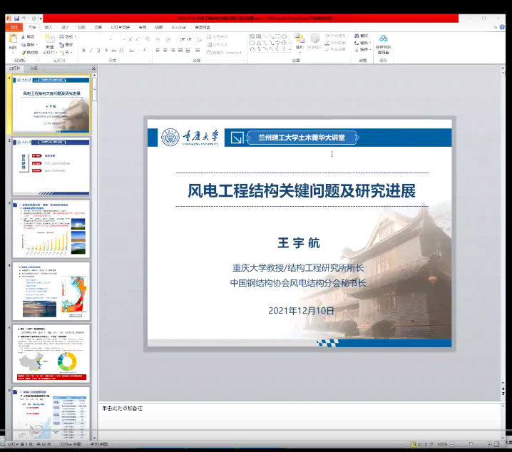 12月10日,重庆大学王宇航教授应学院邀请,在“云端”作了题为“风电工程结构关键问题及研究进展”的学术报告。报告由土木工程学院院长王文达教授主持,报告会场采用线上+线下相结合的方式进行,学院副院长殷占忠教授、副院长李万润副教授、史艳莉教授等相关专业教师、多名研究生以及省内外高校师生(约260余人)参加了本次报告会。