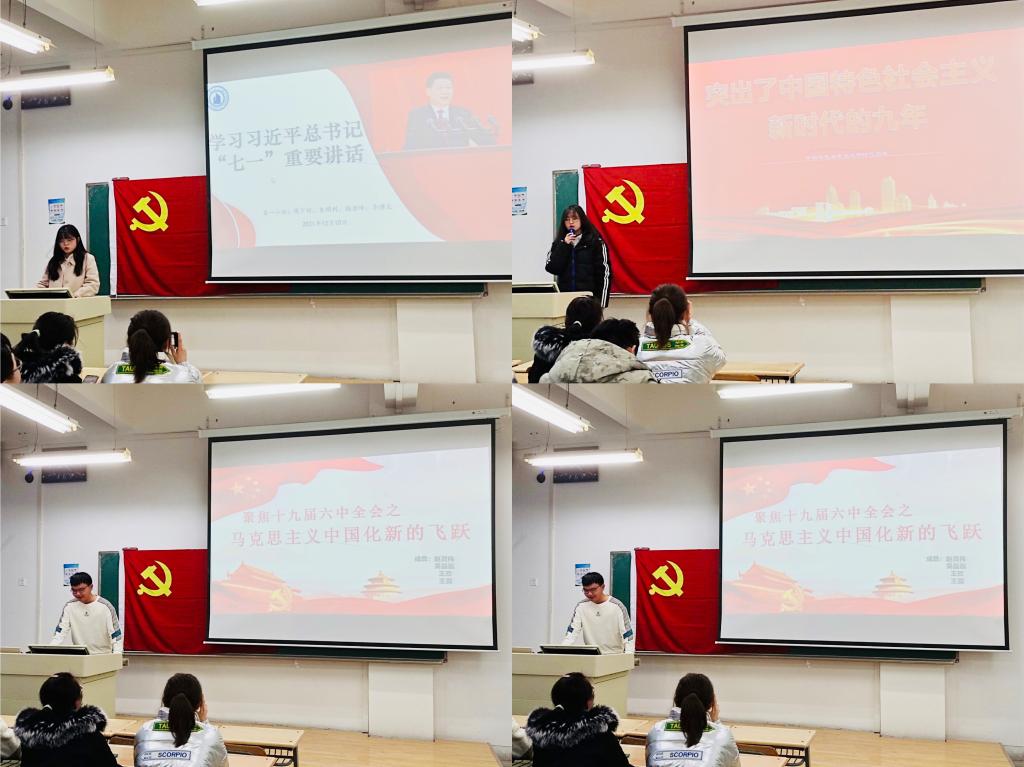 宣讲紧紧围绕十九届六中全会的六个主题开展,从四个历史时期、突出中国特色社会主义新时代的九年、马克思主义中国化新的飞跃、“十四五”到2035的展望蓝图、深入学习十九届六中全会之内涵感悟、学习习近平总书记“七一 ”重要讲话等方面进行了讲解。小组成员宣讲后支部书记薛坚还逐一进行点评。