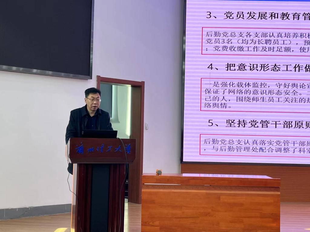 会上,后勤管理处处长曹戈同志作了后勤系统2021年工作总结暨2022年工作计划要点报告、后勤经费使用情况报告。报告汇报了后勤系统的2021年党建与思政工作、重点工作、专项工作和日常服务保障等业务工作开展情况。并提出了下一阶段的工作计划,进一步加强后勤改革发展研究,理顺后勤服务保障工作体制机制,持续提升师生员工满意度,为学校事业发展做出更大贡献。